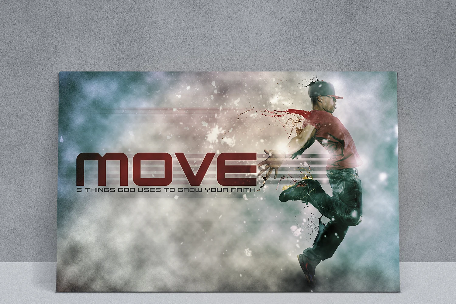 This series tackled the idea of growth and movement in your faith. I wanted to create a graphic that showed that visually. Something that was bold and not meek. I ended up transforming a stock photo of a hip hop dancer and used paint splatters and light to show movement. This was another project that I was able to create a time lapse video of my work in progress.