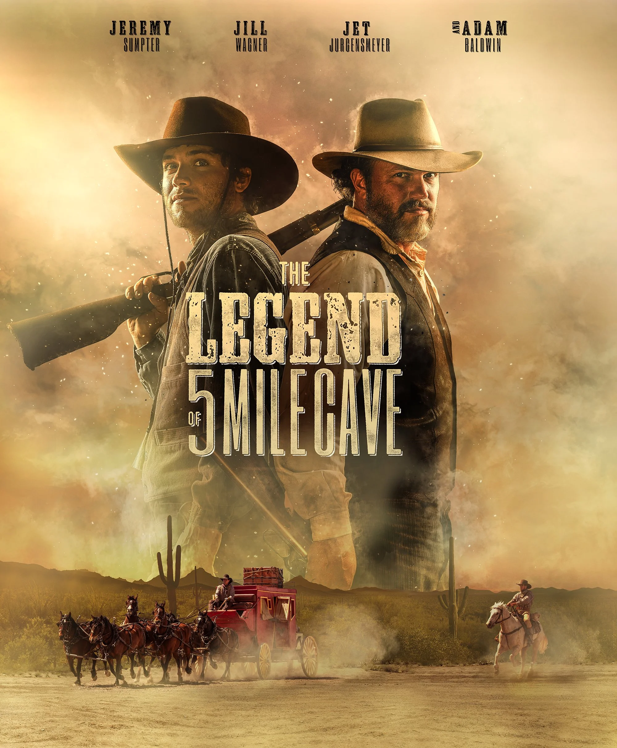 Scale and layering do the narrative heavy lifting. Oversized portraits anchor the frame with gravitas, while the smaller action vignette along the horizon line reinforces scope and movement, suggesting a larger world beyond the central conflict. The warm, dust-filled atmosphere and sun-washed palette evoke heat, danger, and inevitability—hallmarks of the genre—while subtle grain and texture give the image a timeless, poster-worthy finish. Typography is bold and weathered, integrated into the environment rather than floating above it, reinforcing the sense that this is a legend being carved into history rather than a momentary scene.